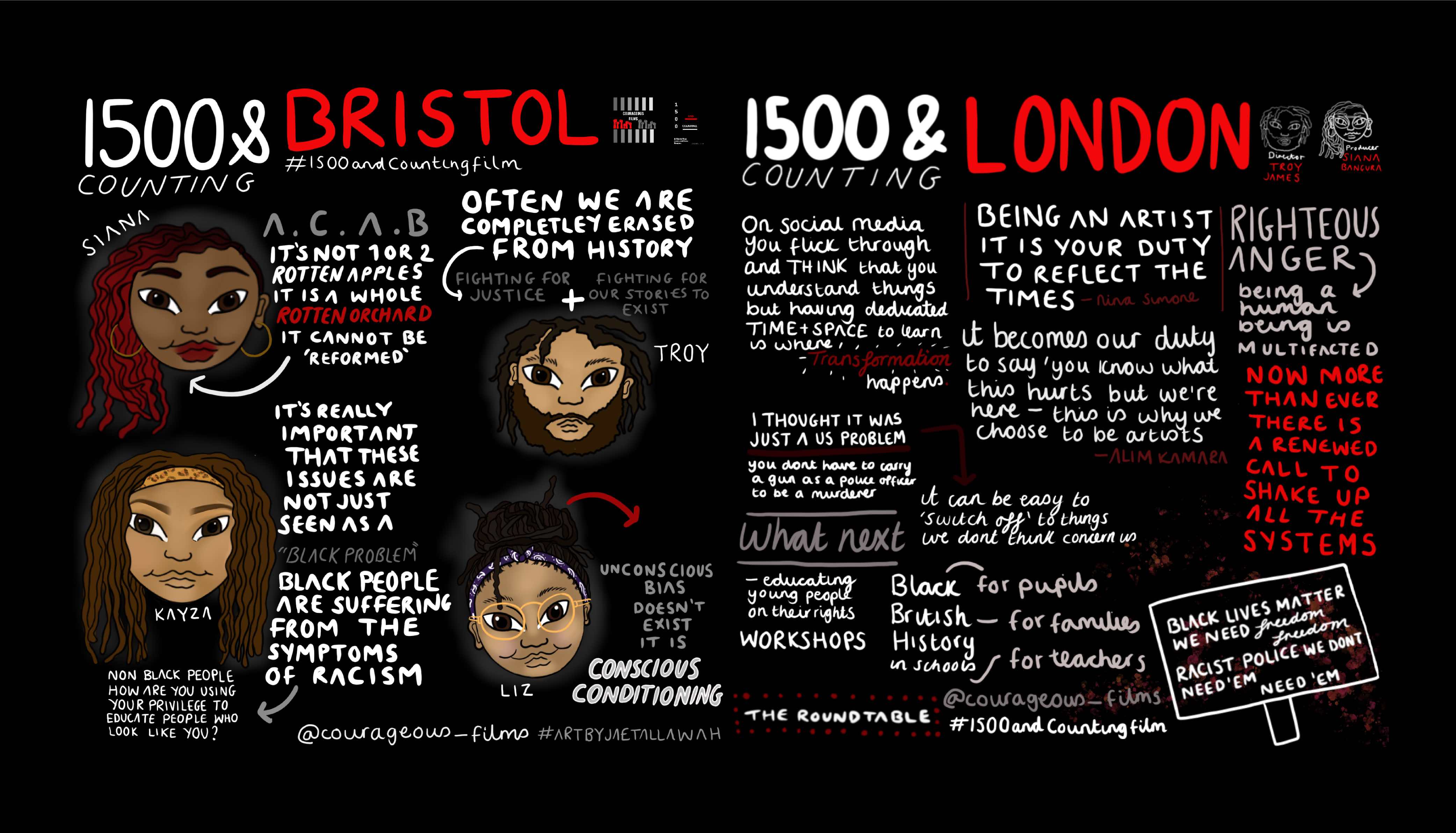 Meet the Executive team at Courageous Films. Courageous Films was founded in 2020 by writer, producer, community organiser, and filmmaker, Siana Bangura off the back of (re)releasing ‘1500 & Counting’, a documentary investigating deaths in custody and police brutality in the UK, originally released in May 2019. She works with Troy James, an award-winning videographer, visual content creator, and ethical filmmaker from South London with almost 10 years of experience creating content for brands, charities, nonprofits and brands looking to improve the world.